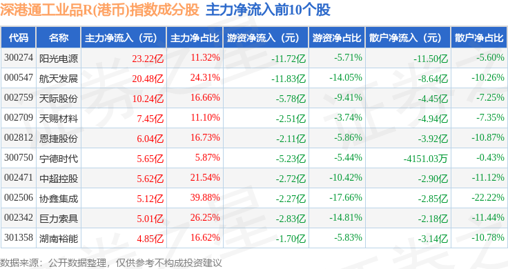 资金流向方面,深港通工业品R(港币)(483070)指数成份股当日主力资金净流入合计37.56亿元,游资资金净流出合计56.0亿元,散户资金净流入合计18.44亿元。成份股资金流向详情见下表: