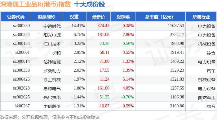 深港通工业品R(港币)(483070)指数十大成份股详情如下:
