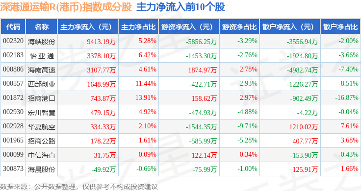 资金流向方面,深港通运输R(港币)(483078)指数成份股当日主力资金净流出合计1583.44万元,游资资金净流入合计1559.83万元,散户资金净流入合计23.62万元。成份股资金流向详情见下表: