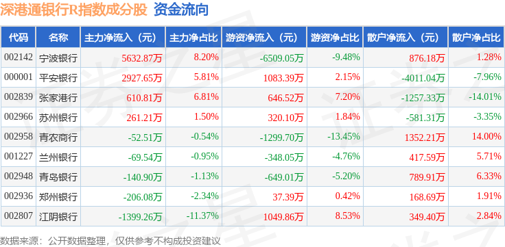 资金流向方面,深港通银行R(483081)指数成份股当日主力资金净流入合计7564.24万元,游资资金净流出合计5668.54万元,散户资金净流出合计1895.7万元。成份股资金流向详情见下表: