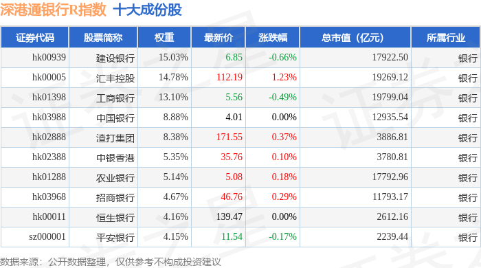 深港通银行R(483081)指数十大成份股详情如下: