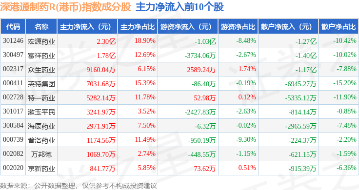 资金流向方面,深港通制药R(港币)(483080)指数成份股当日主力资金净流出合计6.87亿元,游资资金净流入合计8584.03万元,散户资金净流入合计6.01亿元。成份股资金流向详情见下表: