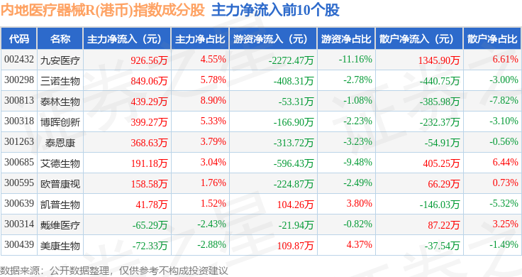 资金流向方面,内地医疗器械R(港币)(483104)指数成份股当日主力资金净流出合计3.83亿元,游资资金净流出合计2601.21万元,散户资金净流入合计4.09亿元。成份股资金流向详情见下表: