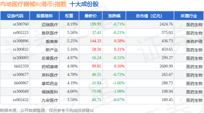 内地医疗器械R(港币)(483104)指数十大成份股详情如下: