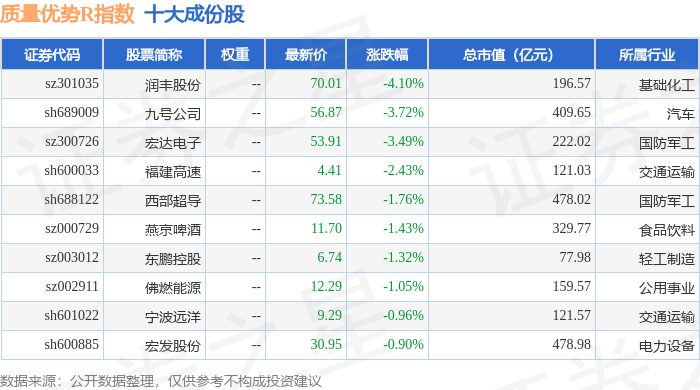 资金流向方面,质量优势R(489017)指数成份股当日主力资金净流出合计9.01亿元,游资资金净流入合计2.06亿元,散户资金净流入合计6.95亿元。成份股资金流向详情见下表: