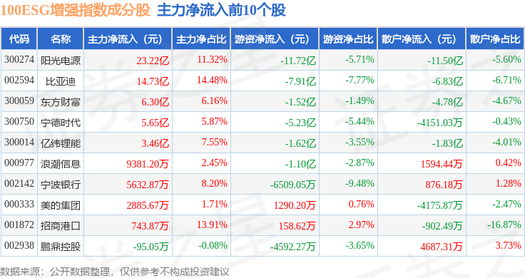 资金流向方面,100ESG增强(970033)指数成份股当日主力资金净流出合计1.19亿元,游资资金净流出合计1.78亿元,散户资金净流入合计2.96亿元。成份股资金流向详情见下表: