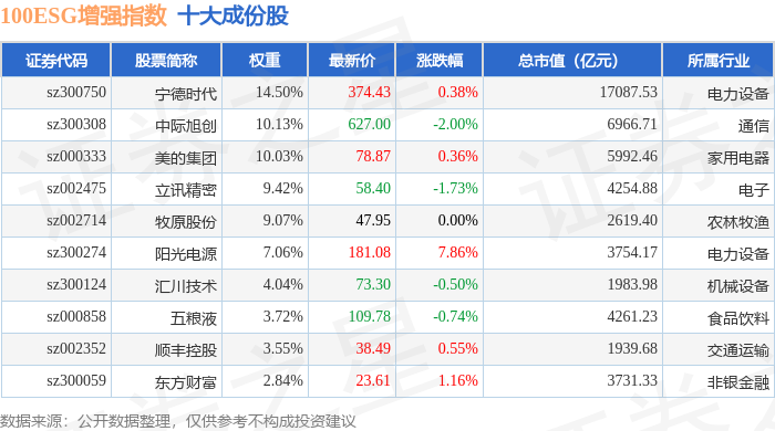 100ESG增强(970033)指数十大成份股详情如下: