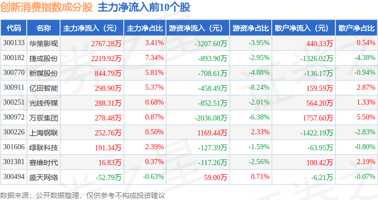 资金流向方面,创新消费(970041)指数成份股当日主力资金净流出合计10.8亿元,游资资金净流入合计609.11万元,散户资金净流入合计10.74亿元。成份股资金流向详情见下表: