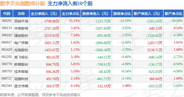 资金流向方面,数字文化(970047)指数成份股当日主力资金净流出合计11.03亿元,游资资金净流出合计1012.9万元,散户资金净流入合计11.13亿元。成份股资金流向详情见下表: