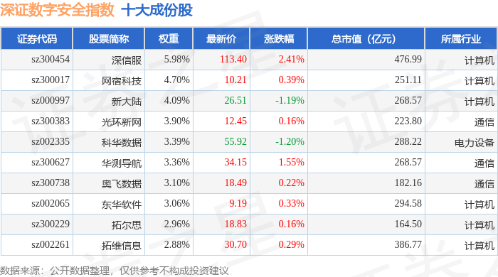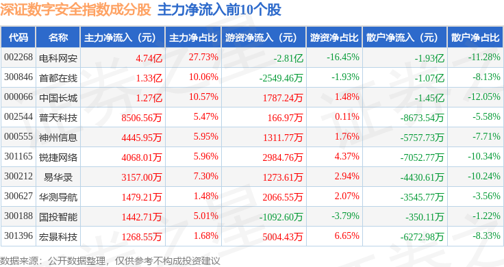 资金流向方面,深证数字安全(970052)指数成份股当日主力资金净流出合计5618.77万元,游资资金净流出合计2.48亿元,散户资金净流入合计3.04亿元。成份股资金流向详情见下表: