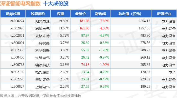 深证智能电网(970054)指数十大成份股详情如下: