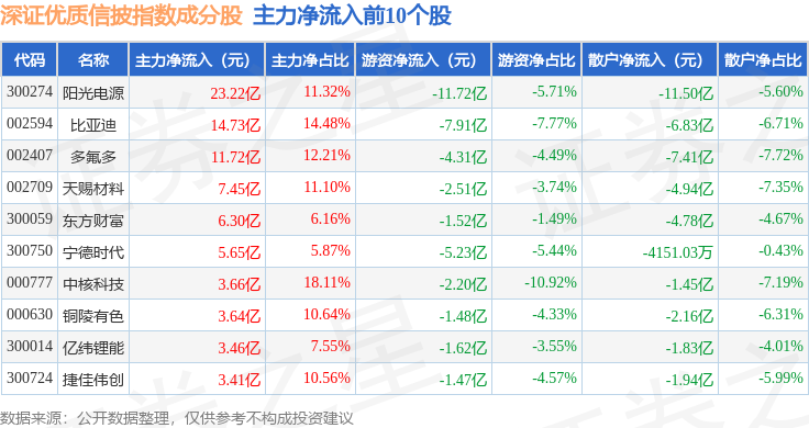 资金流向方面,深证优质信披(970065)指数成份股当日主力资金净流出合计75.74亿元,游资资金净流出合计13.5亿元,散户资金净流入合计89.25亿元。成份股资金流向详情见下表: