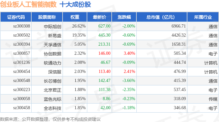 创业板人工智能(970070)指数十大成份股详情如下: