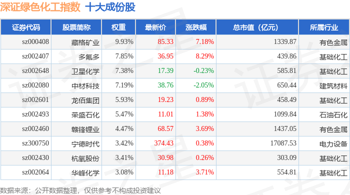 证券之星消息,12月26日,深证绿色化工(970076)指数报收于1787.56点,涨2.02%,成交538.79亿元,换手率2.59%。当日该指数成份股中,上涨的有32家,星源材质以8.87%的涨幅领涨,下跌的有16家,高争民爆以3.17%的跌幅领跌。