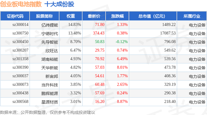创业板电池(970081)指数十大成份股详情如下: