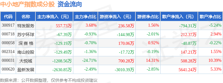 资金流向方面,中小地产(971002)指数成份股当日主力资金净流出合计3607.76万元,游资资金净流出合计2066.17万元,散户资金净流入合计5673.92万元。成份股资金流向详情见下表: