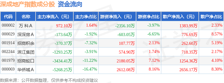 资金流向方面,深成地产(971001)指数成份股当日主力资金净流出合计9567.83万元,游资资金净流入合计2515.65万元,散户资金净流入合计7052.18万元。成份股资金流向详情见下表: