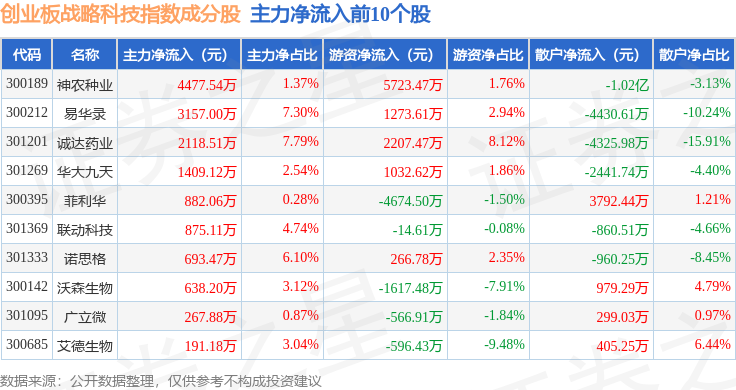 资金流向方面,创业板战略科技(971004)指数成份股当日主力资金净流出合计30.88亿元,游资资金净流入合计4.21亿元,散户资金净流入合计26.67亿元。成份股资金流向详情见下表: