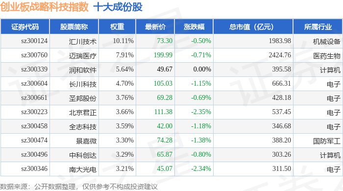 证券之星消息,12月26日,创业板战略科技(971004)指数报收于6553.94点,跌0.58%,成交409.84亿元,换手率4.96%。当日该指数成份股中,上涨的有12家,神农种业以7.32%的涨幅领涨,下跌的有37家,上海新阳以2.77%的跌幅领跌。