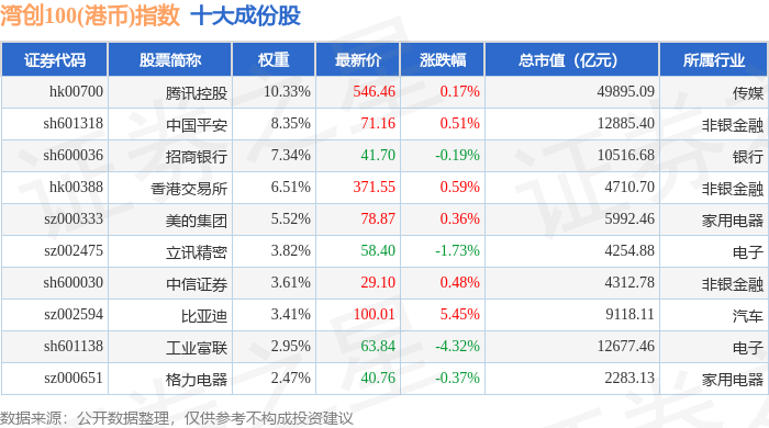 湾创100(港币)(980002)指数十大成份股详情如下: