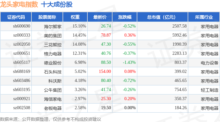 证券之星消息,12月26日,龙头家电(980028)指数报收于12423.69点,跌0.4%,成交157.85亿元,换手率1.11%。当日该指数成份股中,上涨的有5家,莱克电气以2.02%的涨幅领涨,下跌的有22家,德昌股份以2.66%的跌幅领跌。