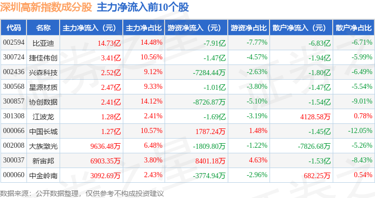 资金流向方面,深圳高新(980038)指数成份股当日主力资金净流出合计2200.91万元,游资资金净流出合计10.18亿元,散户资金净流入合计10.4亿元。成份股资金流向详情见下表: