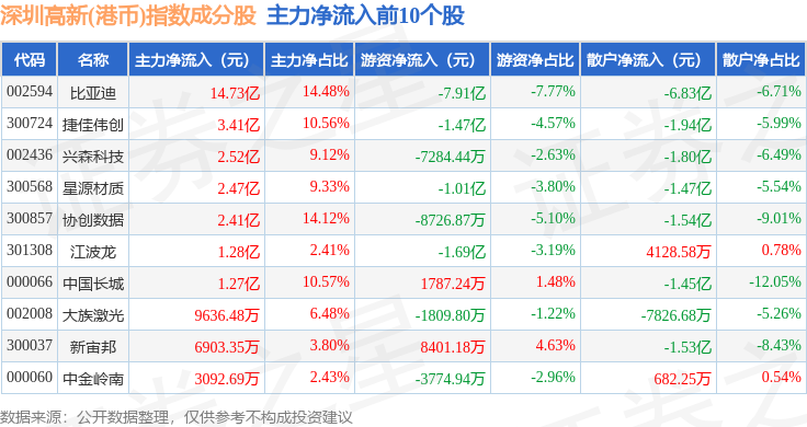 资金流向方面,深圳高新(港币)(980039)指数成份股当日主力资金净流出合计2200.91万元,游资资金净流出合计10.18亿元,散户资金净流入合计10.4亿元。成份股资金流向详情见下表: