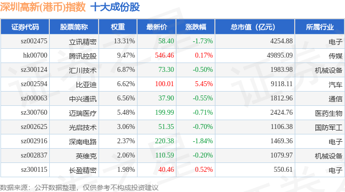 深圳高新(港币)(980039)指数十大成份股详情如下: