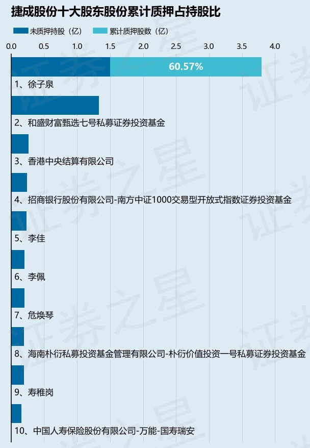 截止本公告日,股东徐子泉已累计质押股份2.3亿股,占其持股总数的60.57%。本次质押后捷成股份十大股东的累计质押股份占持股比例(占持股比例的计算以公司最新一期财务报表公布的十大股东的持股总数为基准)见下图: