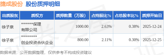 证券之星消息,捷成股份(300182)12月26日公开信息显示,股东徐子泉向******保理有限公司、********创业投资合伙企业合计质押1800.0万股,占总股本0.68%。质押详情见下表: