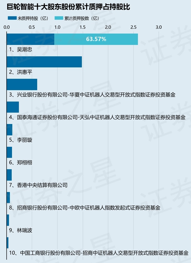 截止本公告日,股东吴潮忠已累计质押股份1.65亿股,占其持股总数的63.57%。本次质押后巨轮智能十大股东的累计质押股份占持股比例(占持股比例的计算以公司最新一期财务报表公布的十大股东的持股总数为基准)见下图: