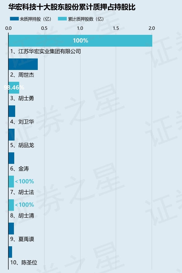 截止本公告日,股东江苏华宏实业集团有限公司已累计质押股份2.01亿股,占其持股总数的100.0%,股东胡士勇已累计质押股份1489.36万股,占其持股总数的98.46%,股东胡士法已累计质押股份775.71万股,占其持股总数的100.0%,股东胡士清已累计质押股份775.71万股,占其持股总数的100.0%。本次质押后华宏科技十大股东的累计质押股份占持股比例(占持股比例的计算以公司最新一期财务报表公布的十大股东的持股总数为基准)见下图: