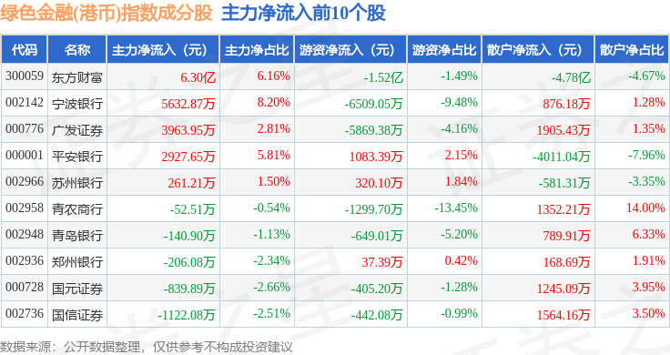 资金流向方面,绿色金融(港币)(980053)指数成份股当日主力资金净流入合计4.36亿元,游资资金净流出合计3.18亿元,散户资金净流出合计1.18亿元。成份股资金流向详情见下表: