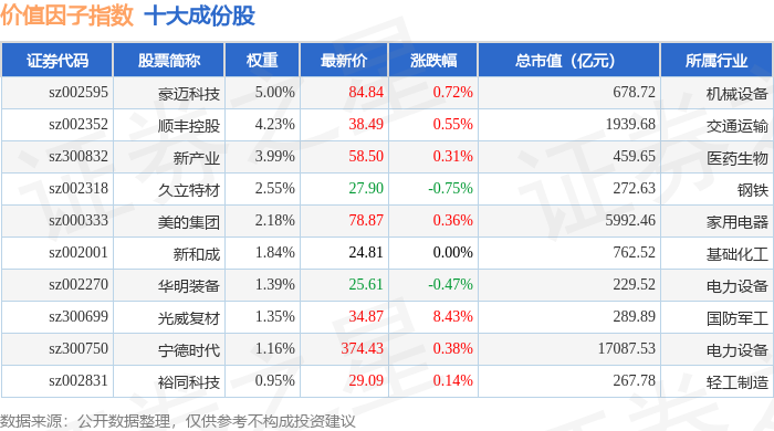 证券之星消息,12月26日,价值因子(980056)指数报收于2659.98点,涨0.8%,成交449.71亿元,换手率0.77%。当日该指数成份股中,上涨的有21家,光威复材以8.43%的涨幅领涨,下跌的有28家,兆威机电以2.27%的跌幅领跌。