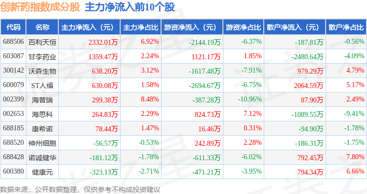 资金流向方面,创新药(980086)指数成份股当日主力资金净流出合计5.98亿元,游资资金净流入合计4376.63万元,散户资金净流入合计5.54亿元。成份股资金流向详情见下表: