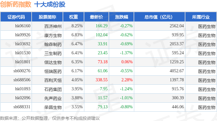 创新药(980086)指数十大成份股详情如下: