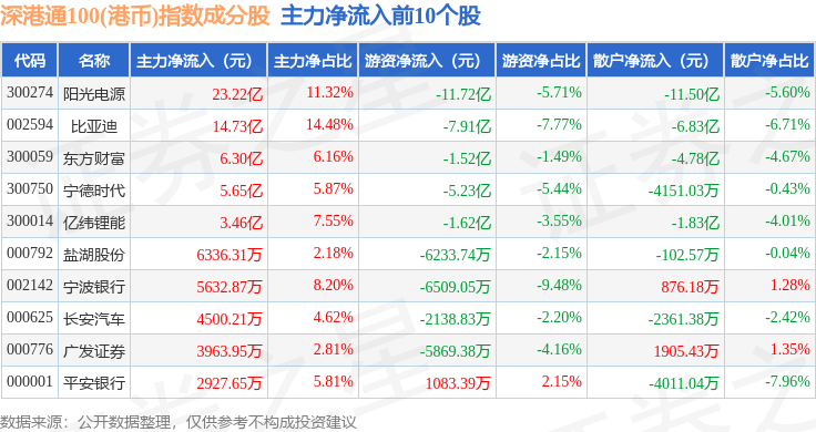 资金流向方面,深港通100(港币)(983008)指数成份股当日主力资金净流出合计14.15亿元,游资资金净流入合计11.48亿元,散户资金净流入合计2.67亿元。成份股资金流向详情见下表: