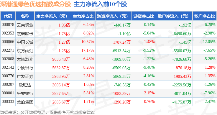 资金流向方面,深港通绿色优选(983011)指数成份股当日主力资金净流出合计19.37亿元,游资资金净流入合计4.91亿元,散户资金净流入合计14.46亿元。成份股资金流向详情见下表:
