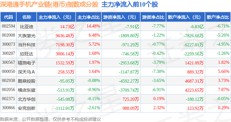 资金流向方面,深港通手机产业链(港币)(983010)指数成份股当日主力资金净流出合计35.54亿元,游资资金净流出合计2.32亿元,散户资金净流入合计37.86亿元。成份股资金流向详情见下表:
