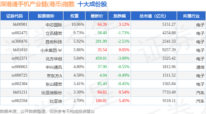 深港通手机产业链(港币)(983010)指数十大成份股详情如下: