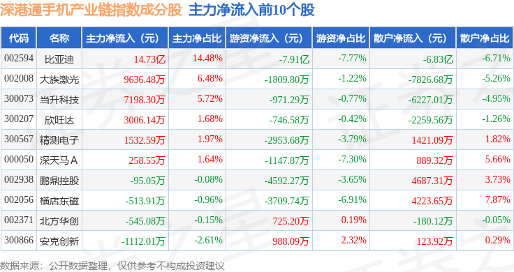 资金流向方面,深港通手机产业链(983009)指数成份股当日主力资金净流出合计35.54亿元,游资资金净流出合计2.32亿元,散户资金净流入合计37.86亿元。成份股资金流向详情见下表: