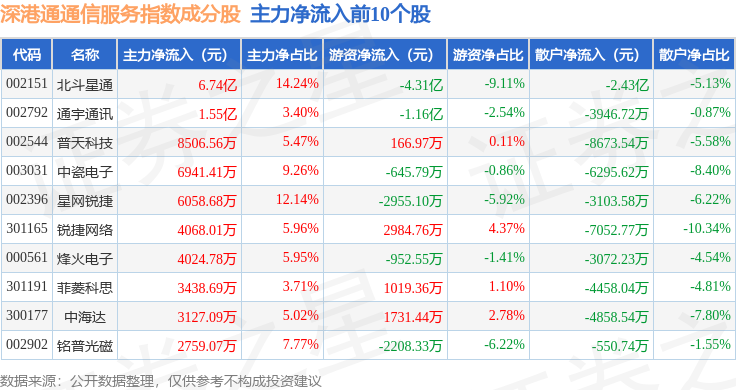 资金流向方面,深港通通信服务(983033)指数成份股当日主力资金净流出合计52.16亿元,游资资金净流入合计26.47亿元,散户资金净流入合计25.7亿元。成份股资金流向详情见下表: