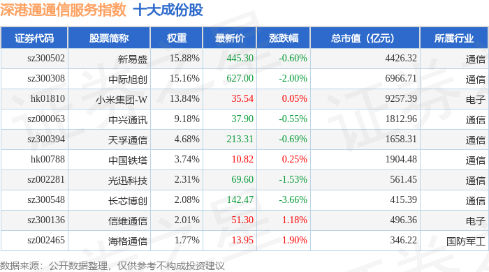 深港通通信服务(983033)指数十大成份股详情如下: