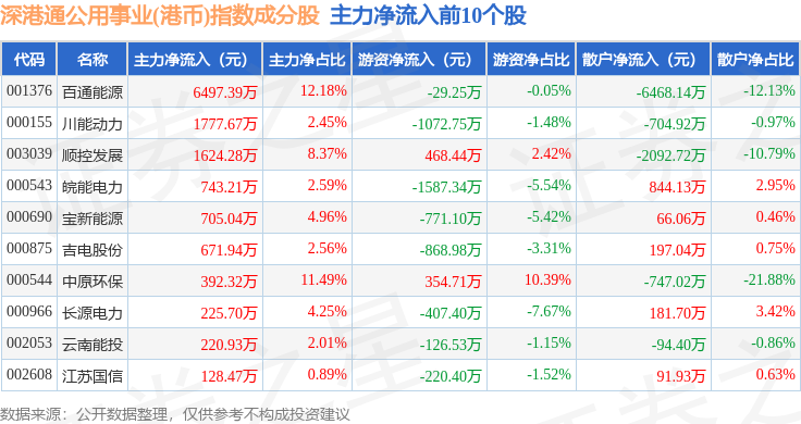 资金流向方面,深港通公用事业(港币)(983032)指数成份股当日主力资金净流出合计1.59亿元,游资资金净流出合计1.04亿元,散户资金净流入合计2.63亿元。成份股资金流向详情见下表: