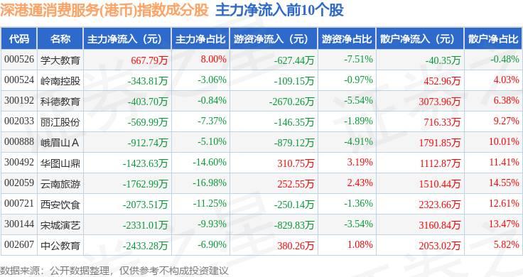 资金流向方面,深港通消费服务(港币)(983046)指数成份股当日主力资金净流出合计3.06亿元,游资资金净流出合计2690.18万元,散户资金净流入合计3.33亿元。成份股资金流向详情见下表: