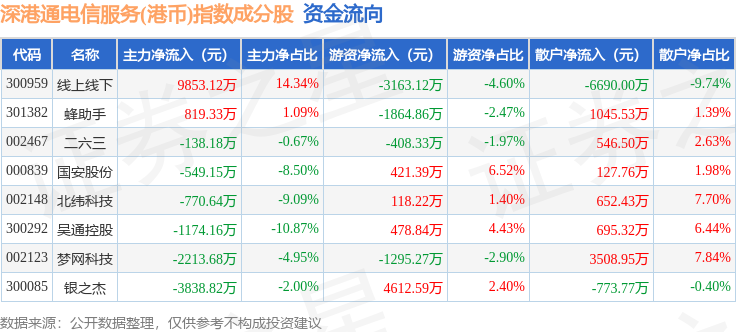 资金流向方面,深港通电信服务(港币)(983058)指数成份股当日主力资金净流入合计1987.81万元,游资资金净流出合计1100.53万元,散户资金净流出合计887.28万元。成份股资金流向详情见下表: