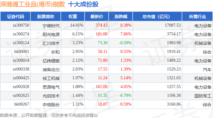 深港通工业品(港币)(983070)指数十大成份股详情如下: