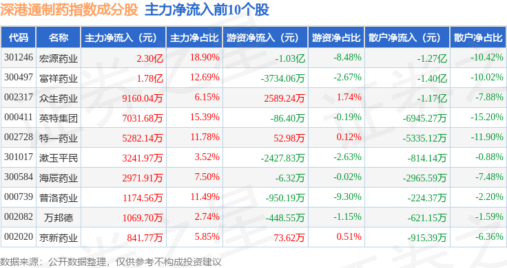 资金流向方面,深港通制药(983079)指数成份股当日主力资金净流出合计6.87亿元,游资资金净流入合计8584.03万元,散户资金净流入合计6.01亿元。成份股资金流向详情见下表: