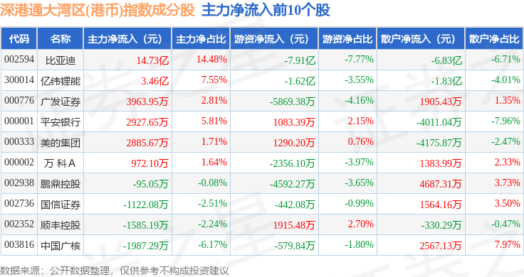 资金流向方面,深港通大湾区(港币)(983090)指数成份股当日主力资金净流出合计7.37亿元,游资资金净流出合计5941.77万元,散户资金净流入合计7.97亿元。成份股资金流向详情见下表: