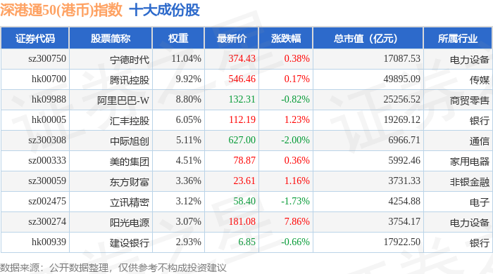 深港通50(港币)(983092)指数十大成份股详情如下:
